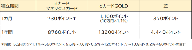これによる獲得ポイント数の差は大きく、仮にNISAで毎月10万円を「dカードGOLD」決済で積立すると、「dカード(マネックスカード)」利用時よりも年間で4000ポイント以上も多くポイントを獲得できます。
