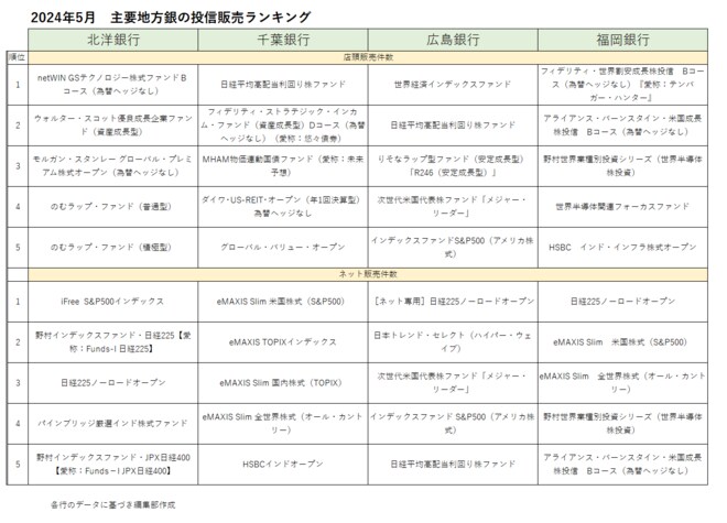 地方銀行の取り扱い投信の品ぞろえは、地域住民の資産形成をサポートするという使命感からゲートキーバー(門番)の役割が感じられる商品が多いことが特徴だ。それだけに、ベストセラー商品を長期にわたって提供し続けるという傾向も強く、必ずしも時流をとらえた商品の販売が多いというわけでもない。2024年5月の売れ筋では、千葉銀行や広島銀行の売れ筋上位にあがっている「日経平均高配当利回り株ファンド」や福岡銀行で上位にあがっている半導体株に投資する投信は、ゲートキーパーの役割を感じさせる時流を捉えた商品といえる。一方で千葉銀行の3位にランクインしている「MHAM物価連動国債ファンド(愛称:未来予想)」などは、ネット証券やメガバンクなどでは売れ筋に入ってこない商品だが、2004年の設定から20年以上の運用実績のある商品をコツコツと販売し続ける地方銀行ならではの売れ筋といえそうだ。