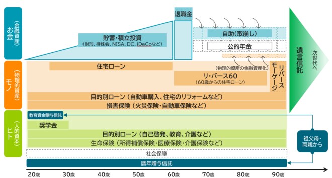 しばしば、生涯の支出のタイミングと手元資金のギャップが生じることがありますが、それを上手に埋めていくパーツが金融商品・サービスです。具体的には、生涯の収支ギャップを解消するために、ヒト資本の形成に関しては奨学金を借りること、モノ資産に関しては、住宅が必要なタイミングと手元資金のギャップを住宅ローンで埋めることが考えらえます。また、借入だけでなく、老後生活を支えるお金については、退職後に生活費より年金の方が少なくなることを想定すると、現役時代に積み上げてきた資産の取り崩しを行う「老後資産形成・資産活用」を生涯にわたり行うことも、「生涯のキャッシュフローをマネジメント」することに該当します。