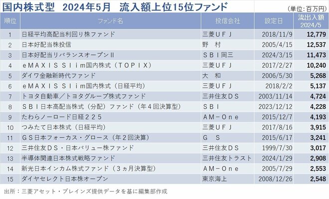 三菱アセット・ブレインズがまとめる2024年5月の国内株式を対象とした公募投信(ETF、DC専用、SMA専用、公社債投信除く)の資金流入額ランキングでは、トップ3が「日経平均高配当利回り株ファンド」、「日本好配当株投信」、「日本好配当リバランスオープン2」と高配当株ファンドが占めた。第4位に「eMAXIS Slim国内株式(TOPIX)」が入るなど、従来のインデックスファンド偏重の売れ筋とは明らかに異なる動きになった。第5位には国内株ファンド(ETF、通貨選択型を除く)の中で5月末時点の1年トータルリターンが66.5%と最も高い「ダイワ金融新時代ファンド」が入るなど、選り抜きといえるファンドに資金流入が集中している。
