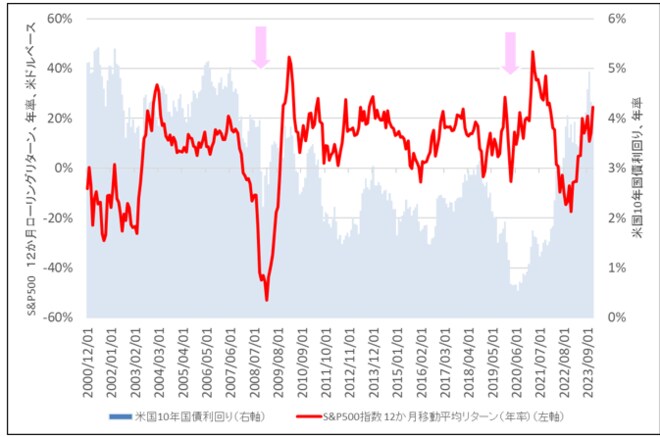 (図表1)米10年国債利回りv.s.S&P500指数(12カ月ローリング)米ドルベース)