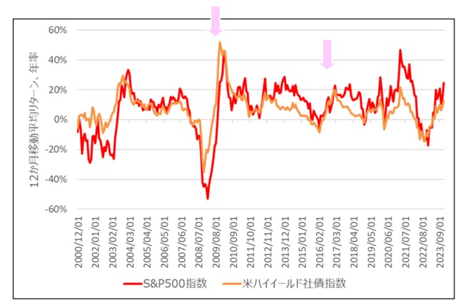 これも過去を振り返ると、リスクオフからの反転時には、株式は当然値上がりするが、ハイイールド社債はそれ以上に値上がりする傾向が往々にして見られる。特に、2008年のリーマンショック後の反発局面、チャイナリスク後の反発局面で顕著だ(図表2)。