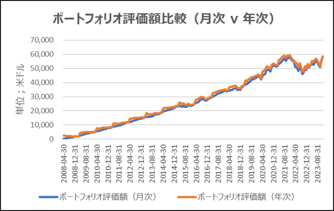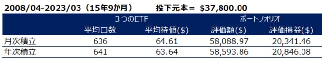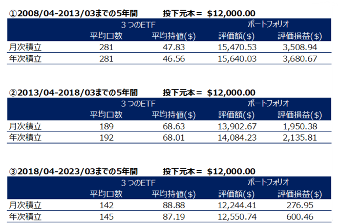 ② 月次積立は、毎年4月以降、各月に200米ドルずつを、年次積立は、毎年4月に2400米ドル(200x12)を、それぞれ投じることとした。なお、最終年の2023年は9カ月となることを踏まえて、投入金額の調整を行った。