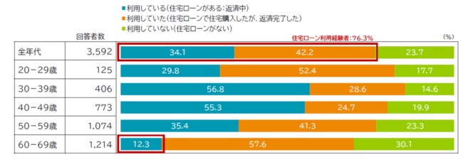 アンケート調査で持ち家購入時の住宅ローンの利用有無についてお伺いしたところ、【図表1】の結果となりました。全年代では、利用している(返済中)が34.1%、利用していた(返済完了)が42.2%、利用していないが23.7%と、76.3%は住宅ローン利用経験者であることがわかりました。