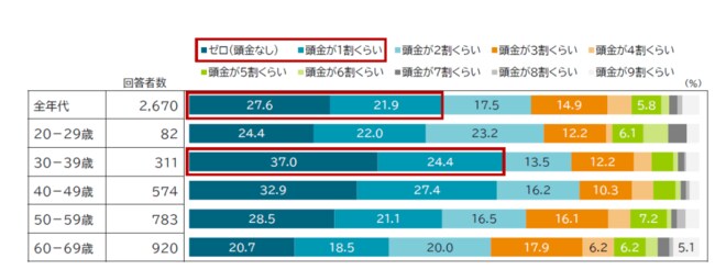 まず、住宅を購入する際の頭金の割合(住宅購入代金のうち、借入ではなく現金で支払う割合)は、全年代で最も多いのがゼロ(頭金なし)で27.6%、次いで多いのが1割くらいで21.9%という結果となりました【図表2】。また、住宅の一次取得者が最も多い30代※を見てみると、ゼロが37.0%、1割が24.4%と6割が頭金ゼロもしくは1割が主流であることがわかりました。