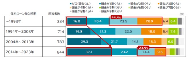 2点目は、頭金「2割・3割」の減少です。1993年の2割・3割は44.4%でしたが、2014年〜2023年では23.9%と大幅に減少しています。かつて住宅購入に際しては、「頭金の準備目安は2・3割」と言われ、実際にそれが主流の時代があったものの、現在では「頭金ゼロで借入れ」に変化していることがわかりました。
