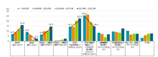 かつての頭金の決め手は、「借入額を小さくしておきたかったから」が最も多く選択されていました。今の決め手は、多い順に「手元にお金を保有しておきたかったから」「金利が低かったから」が選択されていました。
