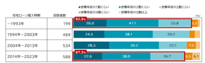そこで、返済比率(年収に占める「年間返済額の割合」)について確認したのが、【図表3】です。1993年以前は、世帯年収の1割が26.0%、2割が41.1%、3割が25.8%と、ここまでが全体のおよそ92.9%と大層を占めます。次に2014年〜2023年を確認すると、世帯年収の1割が22.6%、2割が38.0%、3割が26.7%で、ここまでが全体の87.3%と先ほどよりは若干、減少しているものの、どの借入時期においても9割前後が1〜3割に納めていることがわかりました。