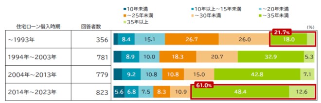 1993年以前は、借入期間(20年以上)〜25年未満が26.7%、(25年以上)〜30年未満が26.0%と、20年以上〜30年の設定が半数超であり、30年以上の借入れは21.7%でした。一方で、2014年〜2023年では、30年以上の借入れが61.0%と大幅に増加していました【図表4】。