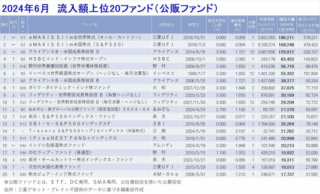 三菱アセット・ブレインズがまとめる2024年6月の公募投信(ETF、DC専用、SMA専用、公社債投信除く)の資金流入額ランキングのトップ3は「eMAXIS Slim 全世界株式(オール・カントリー)」(流入額:1962億円)、「eMAXIS Slim 米国株式(S&P500)」(同:1682億円)、「アライアンスB・米国成長株投信 D」(同:1299億円)で、前月と同じだった。