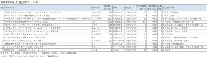 なお、6月に新規設定されたファンドは13本で、設定額は合計約270億円だった。前月と比較して設定本数(前月は16本)、設定額(同約560億円)ともに減少し、直近1年間で最も低い水準になった。新規設定額で最も大きかったのは「三井住友DS・ジャパン・ハイ・コンビクション・ストラテジー」(三井住友DS)(設定額:約120億円)だった。次いで、「いちよし・グローバル好配当戦略ファンド(年6回)」(東京海上)(約60億円)となった。また、新たなインデックスファンドシリーズとして「アムンディ・インデックスシリーズ」(アムンディ)がスタートした。ノーロードで低コストのインデックスファンドながら、「オールカントリー・大型成長株」「オールカントリー・高配当株」など、従来の時価総額加重平均方式のインデックスに「成長株」や「高配当」などの付加価値をつけている点がユニークだ。