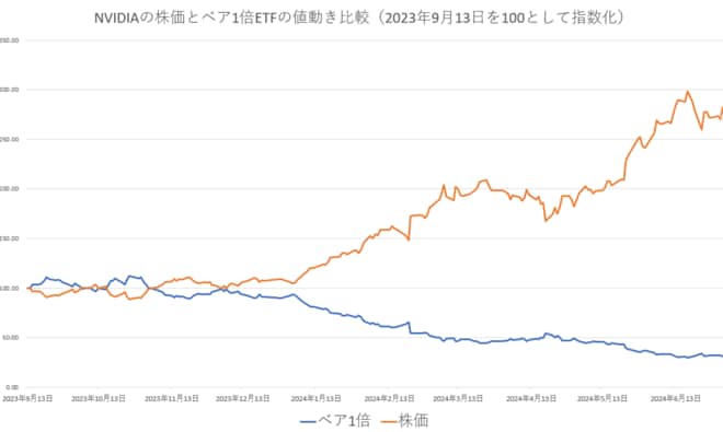 もしこの時、「もういい加減、NVIDIAの株価も下げに転じるだろう」などと考えて、「DirexionデイリーNVDA株ベア1倍ETF」を選んで購入していたら、どうなったでしょうか。2023年9月13日時点を100とした場合の、「DirexionデイリーNVDA株ベア1倍ETF」の取引価格は、2024年7月3日時点で30.87まで下落しています。つまり70%弱の損失を被ったことになるのです。
