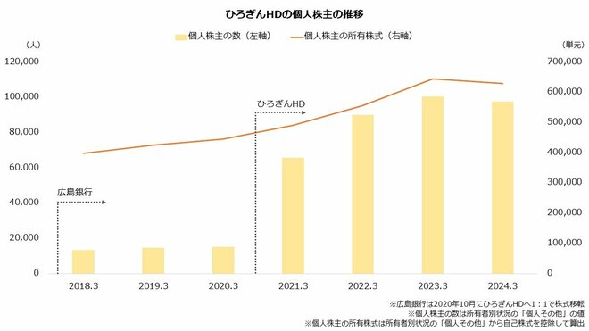 冒頭の通り、ひろぎんHDは多くの個人株主を抱えています。しかし、最初から個人に人気だったわけでありません。ひろぎんHDの個人株主は2021年3月期に急増しました。