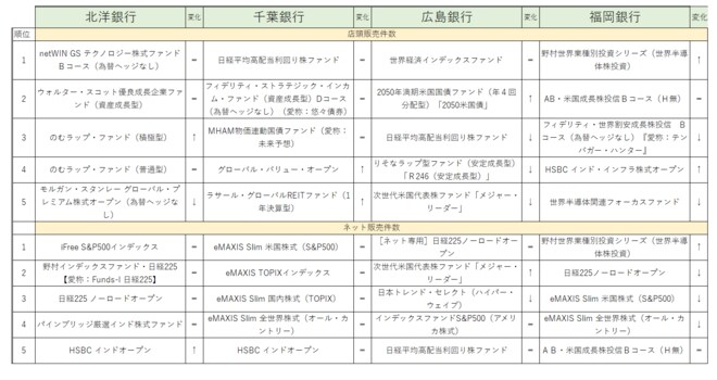 地方銀行の売れ筋は、地域によって個性が色濃く出る。福岡銀行では6月のトップに「野村世界業種別投資シリーズ(世界半導体株投資)」が躍り出た。6月末時点の1年トータルリターンが103.0%という全ファンドで最も高いリターンをあげているファンドだ。ネット販売でもトップとなり、非常に強い人気を集めたことがわかる。