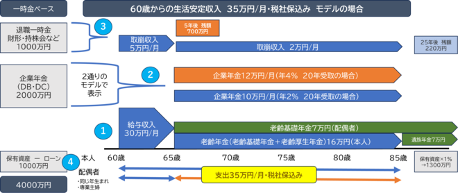 60歳定年後も働いて月30万円程度の収入を得る。退職一時金や財形・持株会などの退職時に受け取った資金から月5万円程度を取り崩す