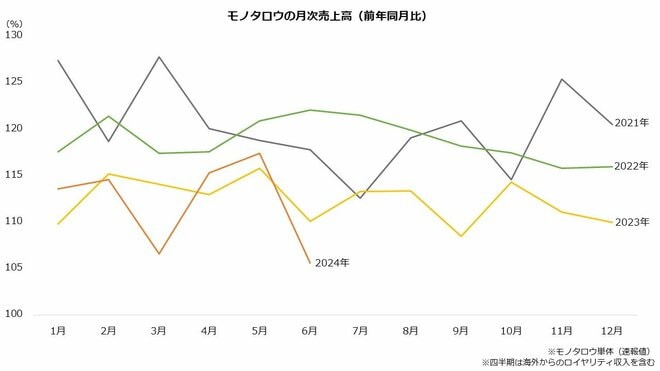 モノタロウの売り上げは右肩上がりに増加していますが、そのペースには陰りが見られます。月次売上高は、2022年までは平均して約20%増加していました。しかし2023年以降はおおむね10%台前半で推移しています。