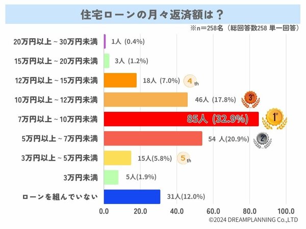 気になる月々の返済額は、「7万円以上~10万円未満」(32.9%)が最も多く、次いで「5万円以上~7万円未満」(20.9%)、「10万円以上~12万円未満」(17.8%)という結果でした。月々7万円以上の返済となると、家計への負担は決して小さくありません。
