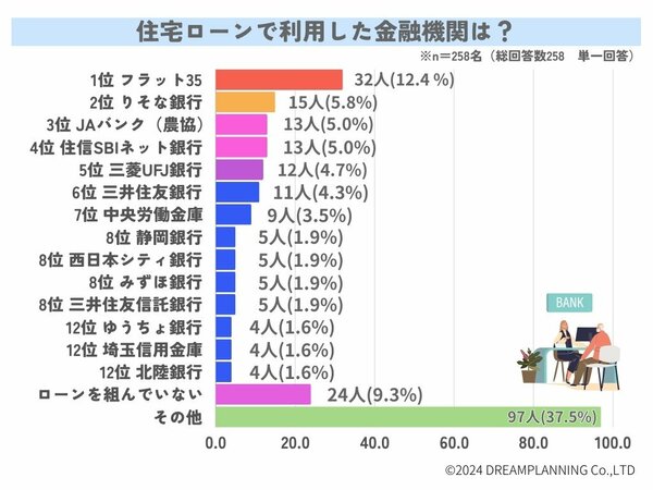 まず、住宅ローンの利用先として最も多かったのは「フラット35」(12.4%)でした。35年間固定金利という安心感と返済計画の立てやすさから、幅広い層から支持を得ているようです。