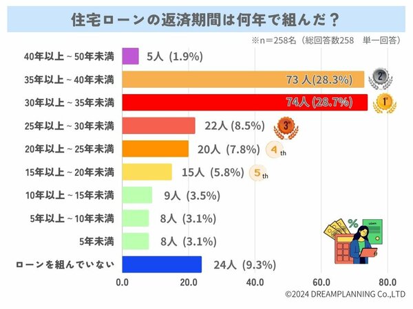 最も多かったのは「30年以上~35年未満」(28.7%)で、次いで「35年以上~40年未満」(28.3%)と、長期返済が主流となっている現状が浮き彫りになりました。