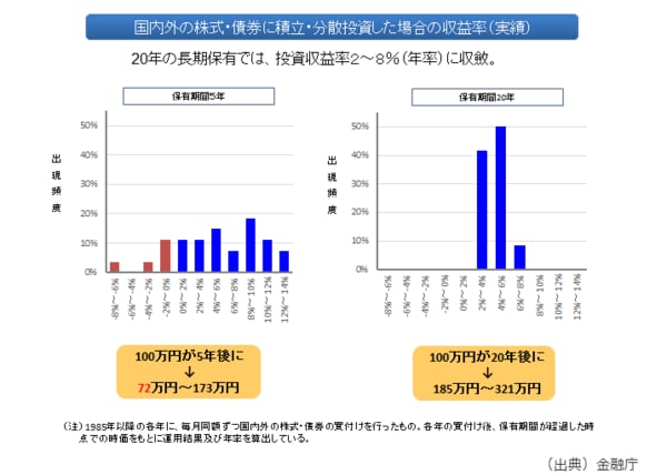特に、積立期間が短くなるほど、元本を割り込む可能性も出てくることを念頭に置いておきましょう。下のグラフは、4資産(国内株式、外国株式、国内債券、外国株式)均等の積立投資で、積立期間が5年の場合と20年の場合を、1985年以降のデータで計算し、比較したものです。