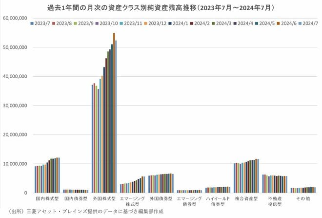 三菱アセット・ブレインズがまとめた2024年7月の公募ファンドの純資産残高は99兆9706億円で前月比3兆2066億円減少した。9カ月ぶりの純資産残高減になった。資金流出入額は、月間で約1兆6240億円の資金純流入(前月の流入額は1兆2710億円)だったが、価格下落によって純資産額がマイナスになった。