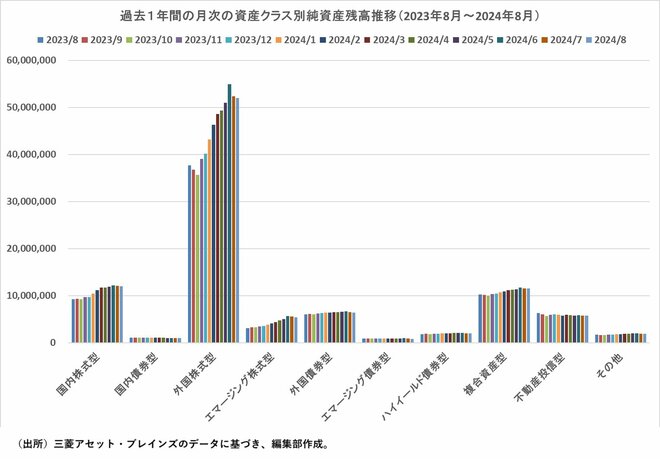 資産別には「外国株式型」が51兆9944億円で残高が前月末比0.73%減少した他、「ハイイールド債券」が同4.28%減、「エマージング債券型」が前月末比3.90%減、「エマージング株式型」が前月末比3.67%減少した。資金流出入では資産別にみると「外国株式型」(約7270億円)、「国内株式型」(約2280億円)、「複合資産型」(約910億円)の順で資金流入があったが、「外国株式型」は前月の約1兆2270億円から流入額を大幅に減額した。「国内株式型」は前月の約1490億円から流入額が増額した。一方、資金流出は「不動産投信型」(約280億円)、「国内債券型」(約68億円)、「ハイイールド債券型」(約45億円)の順に資金が流出した。