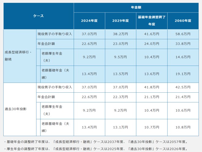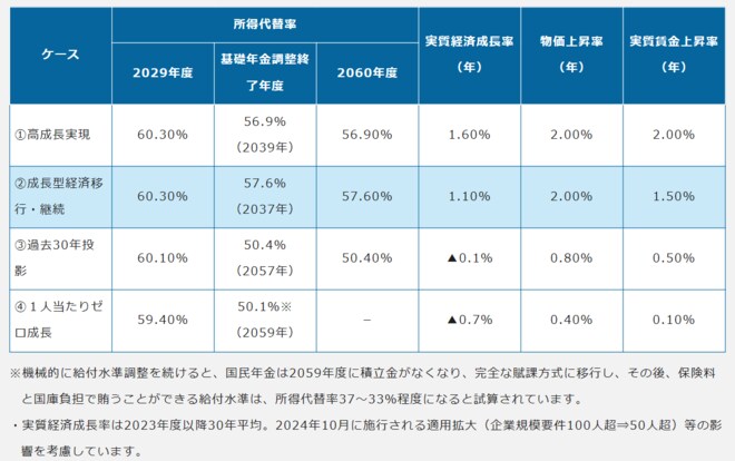 「②成長型経済移行・継続」のケースでは、2024年度に61.2%となった所得代替率が、基礎年金の調整が終了する2037年度には57.6%まで低下するものの50%は維持される見込みです。