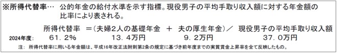 今回の財政検証では、2024年度のモデル世帯(会社員だった夫と専業主婦)の所得代替率が61.2%となり、前回の2019年度財政検証では、2024年の所得代替率が60.2%まで低下すると推計されていましたので、それを上回る結果となりました。