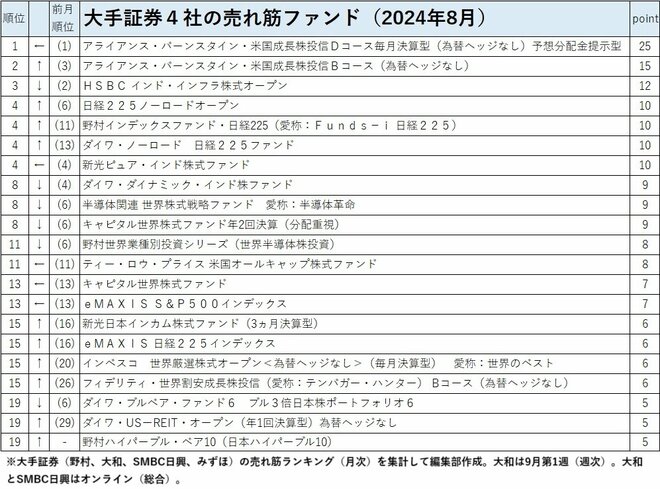 ランキングは、大手証券(野村、大和、SMBC日興、みずほ)の代表的な売れ筋ランキングについて、トップに10点、以下、順位が下がるごとに1点減点して10位を1点としてポイントを付与し、そのポイントを合算してポイント上位から並べたもの。各社の公開情報に基づくもので、大和とSMBC日興はオンライン(総合)。また、大和の売れ筋は9月第1週の1週間分のみのランキングを使っている。