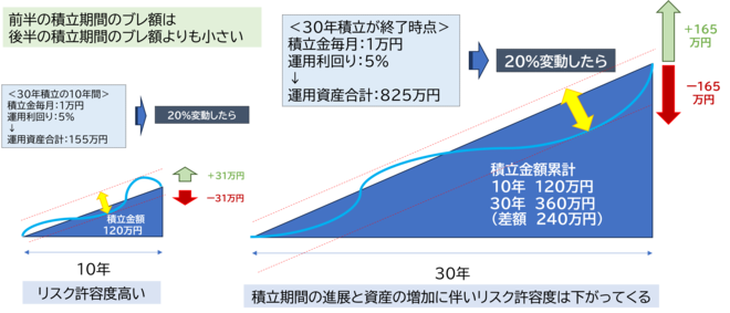 左が10年間積み立てを行った場合、右が30年間積み立てを行った場合の運用イメージです。積みあがっていく元本を示す斜めの線を中心に、黄色の矢印でリスク(ブレ額)を示しています。