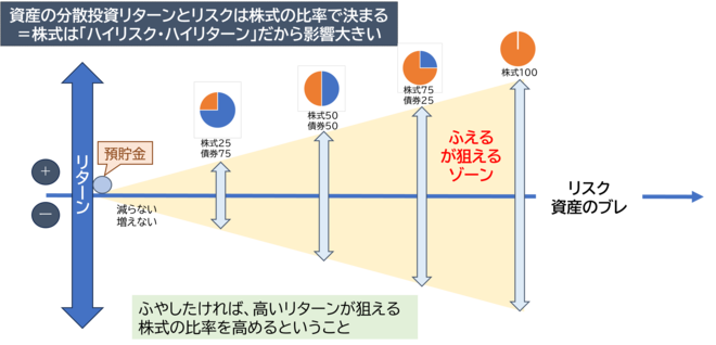資産を預貯金100%で持てば増減がほとんどない一方、株式100%で持てば増加を狙えます。ただしその分、ブレ幅は大きくなります。なお株式だけでなく債券を一定比率持てば、大きなブレ幅をある程度抑えることができます。