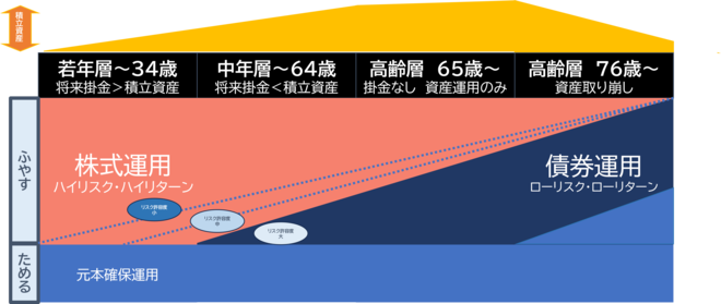 若年層は、これまで積み立てた資産(積立資産)よりも今後積み立てる掛金(将来掛金)の方が大きい時期です。長期でふやす目的であれば株式100%の運用を検討します。また、大きな値動きが怖いと感じる人や、近い将来に引き出す予定がある人は、ローリスク・ローリターン~ミドルリスク・ミドルリターン運用が狙える債券を組み入れると良いでしょう。