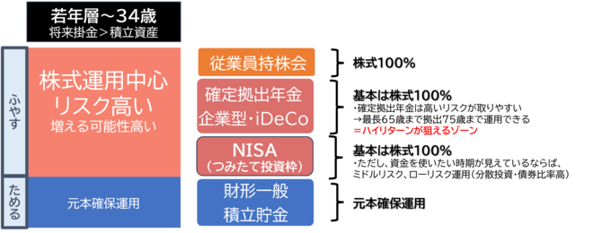 34歳までの若年層は、今後積み立てる掛金(将来掛金)がこれまで積み立てた資産(積立資産)よりも大きい期間。リスク許容度が高いことが強みなので、長期投資を前提に株式100%の運用を第一に検討します(個別株でなく投資信託を選択する)。時間が武器となるこの年代の方におすすめしたい運用方法は、利用できるほぼすべての制度で株式運用をするパターンです。