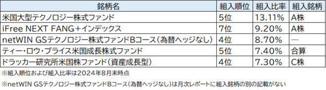 その他の銘柄の影響を小さくしたいなら、組み入れ順位が高い銘柄を選ぶのも手です。「netWIN GSテクノロジー株式ファンドBコース(為替ヘッジなし)」は、上記5銘柄の中では組み入れが最高位で、組み入れ比率も高くなりました。