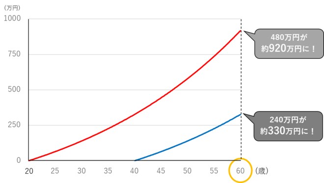 長期・積立・分散投資と複利(投資や預金等で得た収益を、当初の元本にプラスして運用することで得られる利益)の効果には時間が重要です(下図参照)。40代・50代で老後資金の準備をスタートすると貯蓄する金額も多く、複利効果も十分に活用できません。だから、20代から資産形成を考えます。20代にとって老後は遠い将来の話ですが、遠い将来の話だからこそ時間を味方にして、少ない金額でしっかり準備ができるのです。