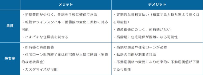 まず、決断を迫られるのが、賃貸か持ち家かの問題です。以下にそれぞれのメリット・デメリットをまとめました。