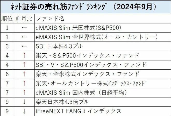 ネット証券の投信売れ筋ランキングの2024年9月のトップ3は前月と同様に同率で第1位に「eMAXIS Slim 全世界株式(オール・カントリー)」と「eMAXIS Slim 米国株式(S&P500)」、そして、第3位に「SBI 日本株4.3ブル」と変化がなかった。前月に同率の第3位だった「iFreeNEXT FANG+インデックス」が第9位に大きく後退し、前月に第8位だった「楽天日本株4.3倍ブル」が第9位に落ちたため、その他の「楽天・S&P500インデックス・ファンド」、「SBI・V・S&P500インデックス・ファンド」、「楽天・全米株式インデックス・ファンド」などが順位を繰り上げた。