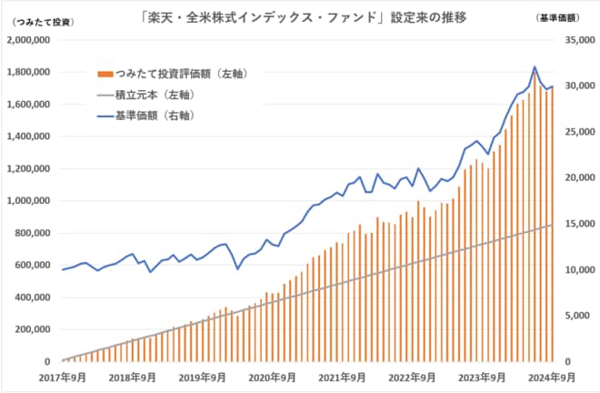 また、「楽天・全米株式インデックス・ファンド」を2017年9月末の設定時から、毎月月末に1万円ずつ積立投資をした場合、2024年8月末までの7年間で投資元本が84万円に対し、積立投資の評価額は168万円になった。7年間で投資した資金が2倍になった計算だ。