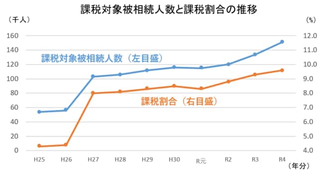 また、相続税の対策も必要です。相続税には一定の基礎控除などがありますが、それを超えると相続財産に応じて税金がかかります。2015年(平成27年)から相続税の基礎控除が「3,000万円+600万円×法定相続人の数」に引き下げられて以降、相続税が課税される割合が増加し、2022年(令和4年)には約1割になりました(資料2)。