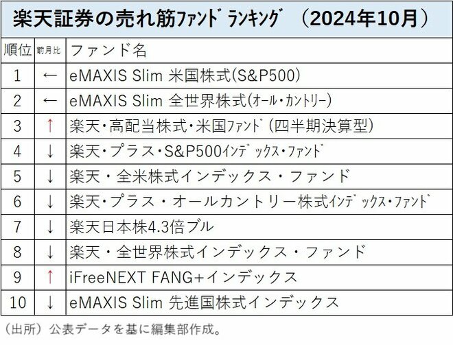 楽天証券の投信売れ筋ランキングの2024年10月のトップ2は前月と同様に「eMAXIS Slim 米国株式(S&P500)」、「eMAXIS Slim 全世界株式(オール・カントリー)」だった。今年に入ってから、この2銘柄がトップ2を独占し、2月までは「eMAXIS Slim 全世界株式(オール・カントリー)」がトップだったものの、3月以降は「eMAXIS Slim 米国株式(S&P500)」がトップを独走している。第3位には前月10位だった「楽天・高配当株式・米国ファンド(四半期決算型)」がジャンプアップした。また、第9位にトップ10圏外から「iFreeNEXT FANG+インデックス」がランクインし、この2銘柄の上昇によって他の銘柄はランクを落とす結果になった。