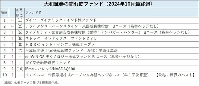 大和証券の投信売れ筋ランキング(週間)の2024年10月(最終週)のトップ2は前月と同様に「ダイワ・ダイナミック・インド株ファンド」、「アライアンス・バーンスタイン・米国成長株投信Bコース(為替ヘッジなし)」だったが、第3位以下が大きく変動した。前月(最終週)は第3位と第4位だった「ダイワ・ブルベア・ファンド6 ブル3倍日本株ポートフォリオ6」と「ダイワ・ノーロード 日経225ファンド」がトップ10から滑り落ち、代わりにトップ10圏外から第7位と第8位、第10位に「netWIN GS テクノロジー株式ファンド Bコース(為替ヘッジなし)」と「ダイワ金融新時代ファンド」、「インベスコ 世界厳選株式オープン<為替ヘッジなし>(年1回決算型)【愛称:世界のベスト】」が食い込んだ。