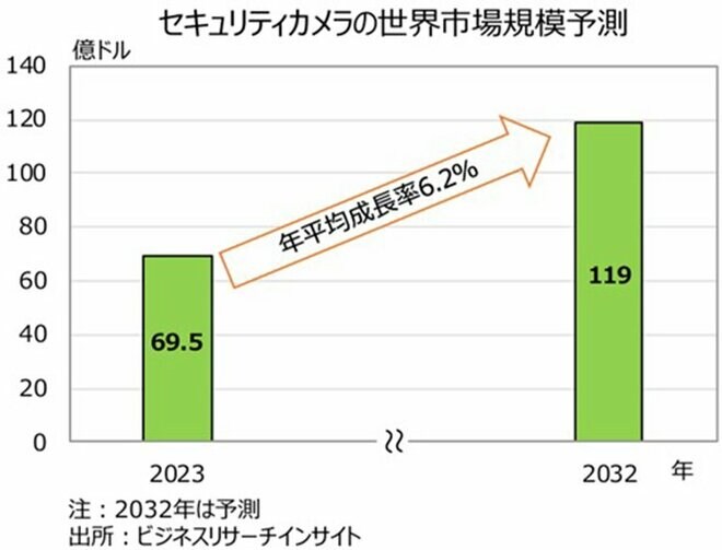 神様:世界的にも需要が見込まれています。セキュリティカメラの世界市場規模は、2023年で69億5,000万ドルでした。今後は年平均で6.2%の成長が見込まれ、2032年までに119億ドルに達すると予測されています。