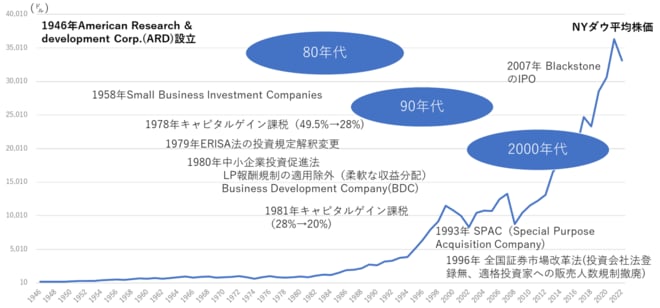 下図は1940年代からのNYダウ平均株価推移と米国におけるPE投資の変遷をまとめたものです。
