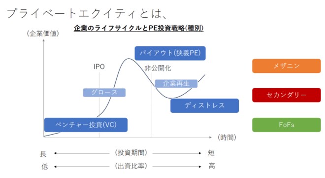 プライベートエクイティ(PE)投資とは未公開企業への投資を指し、投資先企業のライフサイクルによって戦略が異なります。