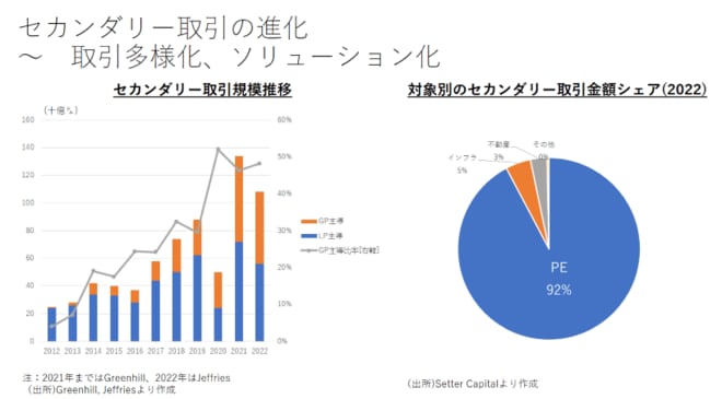 下図右は2022年における対象別のセカンダリー取引金額シェアです。92%がPEですが、インフラや不動産にも広がってきています。