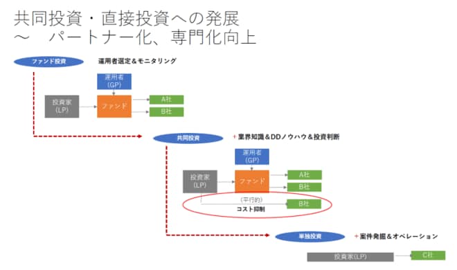 そして、次のPE投資の進化として共同投資や直接投資があります。通常は下図左上のようにファンドを経由して投資先企業への投資が行われますが、下図中央のようにGPが投資家に向けて共同投資の機会を提供するケースがあり、大手機関投資家は高いリターンを求めて活用することができます。またソブリンウェルスファンド(SWF)など専門性を高めた投資家は、下図右下のようにGPを介さず、単独投資を進めるケースも出てきています。