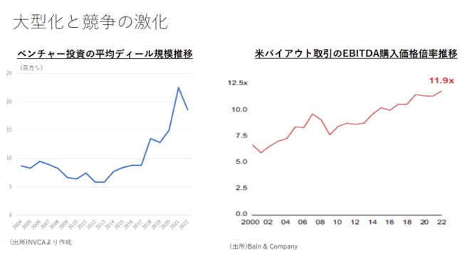 下図左は、米国におけるベンチャー投資の平均ディール規模の推移です。2013年以降、規模の急激な上昇が見て取れます。