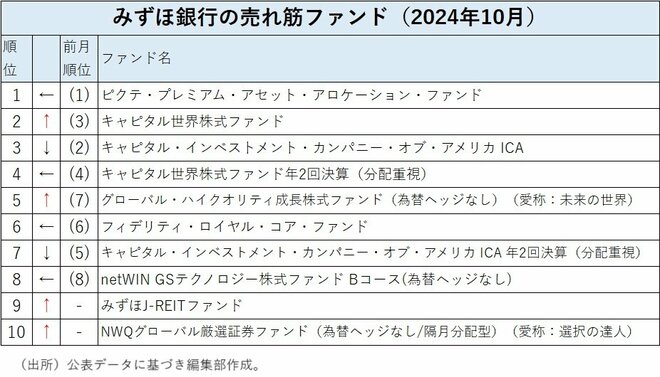 みずほ銀行の投信売れ筋ランキングの2024年10月は、トップが7カ月連続で「ピクテ・プレミアム・アセット・アロケーション・ファンド」になった。また、前月7位だった「グローバル・ハイクオリティ成長株式ファンド(為替ヘッジなし)(愛称:未来の世界)」が第5位に上昇し、前月はトップ10圏外だった「みずほJ-REITファンド」が第9位に、「NWQグローバル厳選証券ファンド(為替ヘッジなし/隔月分配型)(愛称:選択の達人)」が第10位に入った。