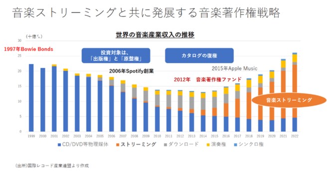 音楽著作権への投資事例としては、1997年のデビッド・ボウイの楽曲から発生するキャッシュフローを担保としたABS、いわゆる「ボウイ債」の発行がありました。そして2000年に入ると銀行や年金、PEが著作権を持つ会社への投資を行っていきました。
