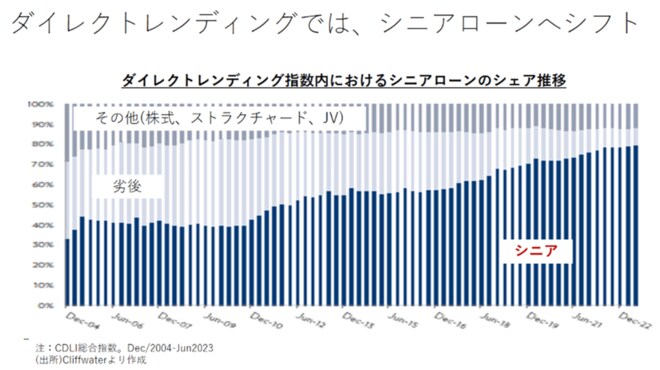 また、DLにおけるシニアローンのシェアを見たのが下図です。劣後部分が減少し、シニア部分が増えているのが分かります。信用力が上がるという点では良いのですが、競争の激化による利回り低下には注意が必要です。